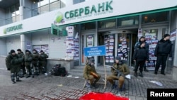 В управлении Национальной полиции украинской столицы сообщили, что начиная с половины девятого утра "группы неизвестных мужчин прибыли к отделениям и пытаются попасть внутрь, в то время как другие активисты разливают у дверей банков краску и клеят плакаты".